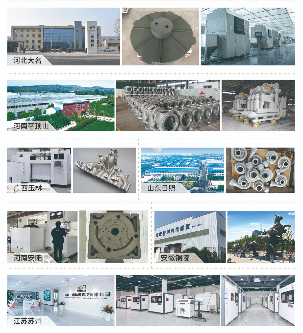 Il Centro di fusione 3D di Xianyang copre un'area di 22.000 metri quadrati, con un'area di costruzione esistente di 18.000 metri quadrati. Dispone di oltre 50 set di attrezzature avanzate per la fusione e la lavorazione. Tra cui attrezzature per la stampa 3DP in sabbia, attrezzature per la stampa 3D a sinterizzazione laser selettiva SLS e attrezzature avanzate per la formatura e il collaudo, come CMM, scanner 3D laser, spettrometro a vuoto a lettura diretta, ecc. con una capacità produttiva annuale di circa 1.800 tonnellate di getti. Attraverso la colata in sabbia, la colata a bassa pressione, la colata di precisione, la colata di tipo metallico e altri processi di colata professionali, forniamo una produzione di prova rapida in piccoli lotti di getti in lega di alluminio, lega di rame, boccole di rame resistenti all'usura, bronzo allo stagno, bronzo all'alluminio, ghisa, acciaio fuso e altri getti.